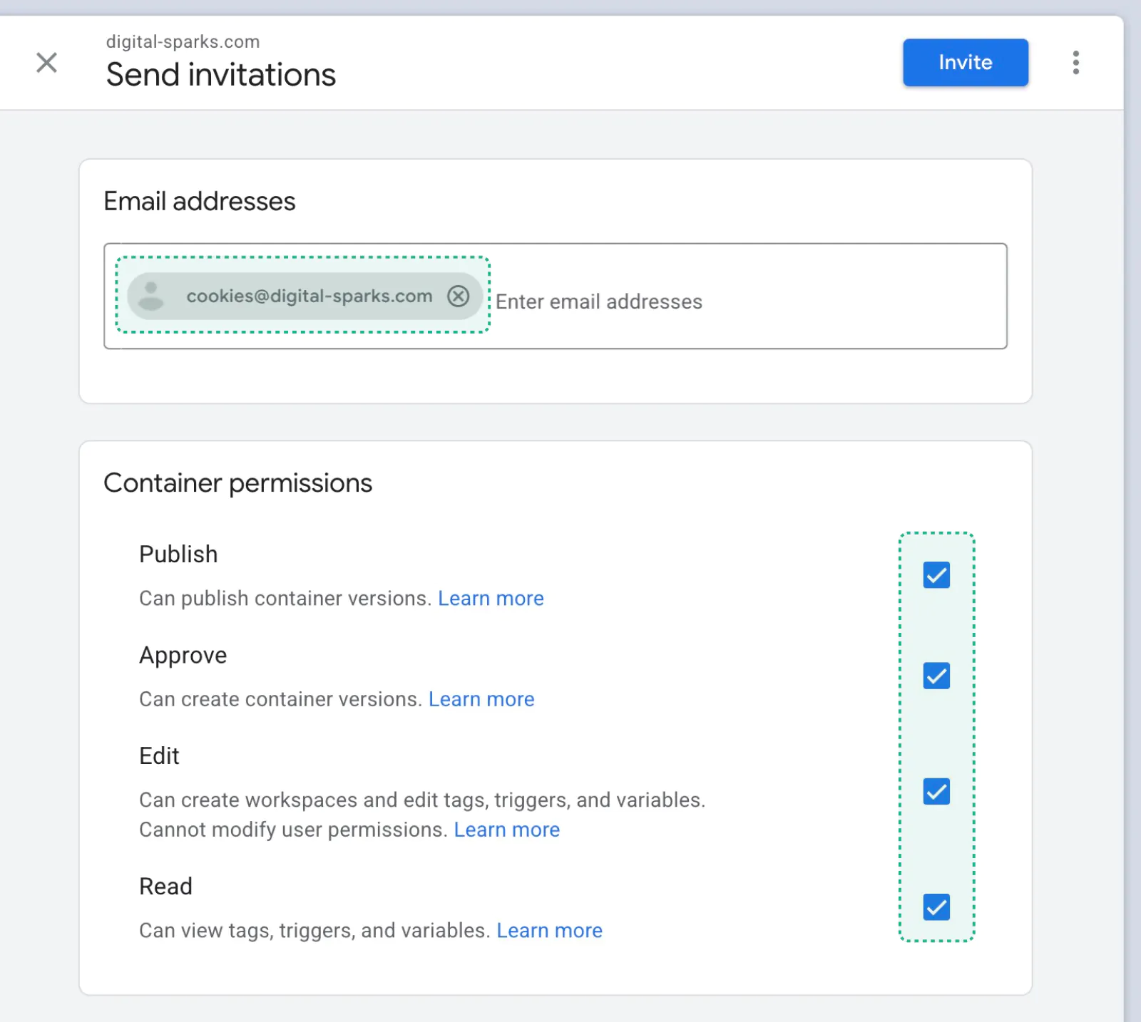Enter cookies@digital-sparks.com in the email address field, and ensure the 'Publish', 'Approve', 'Edit' and 'Read' options are checked uder 'Container permissions'.