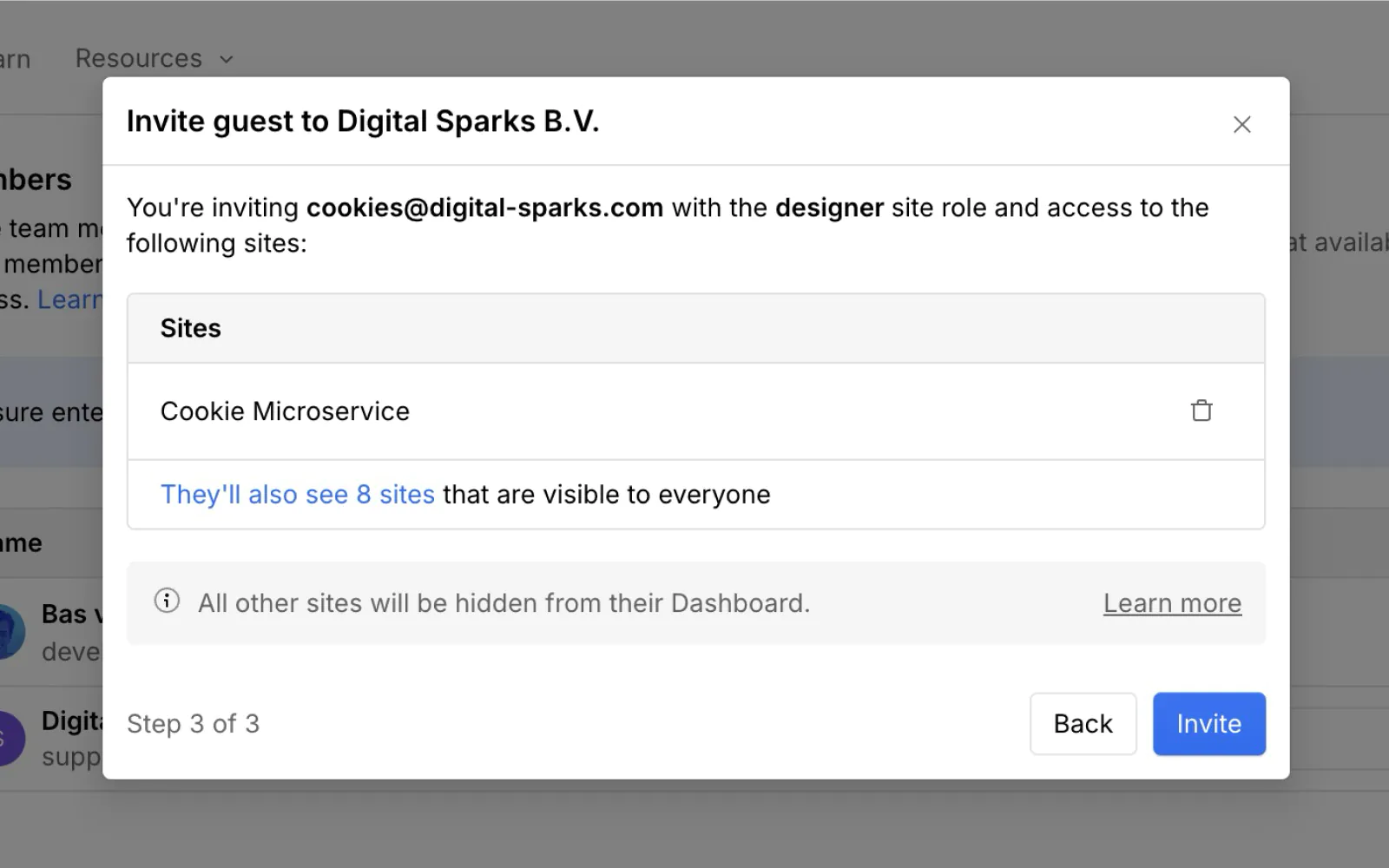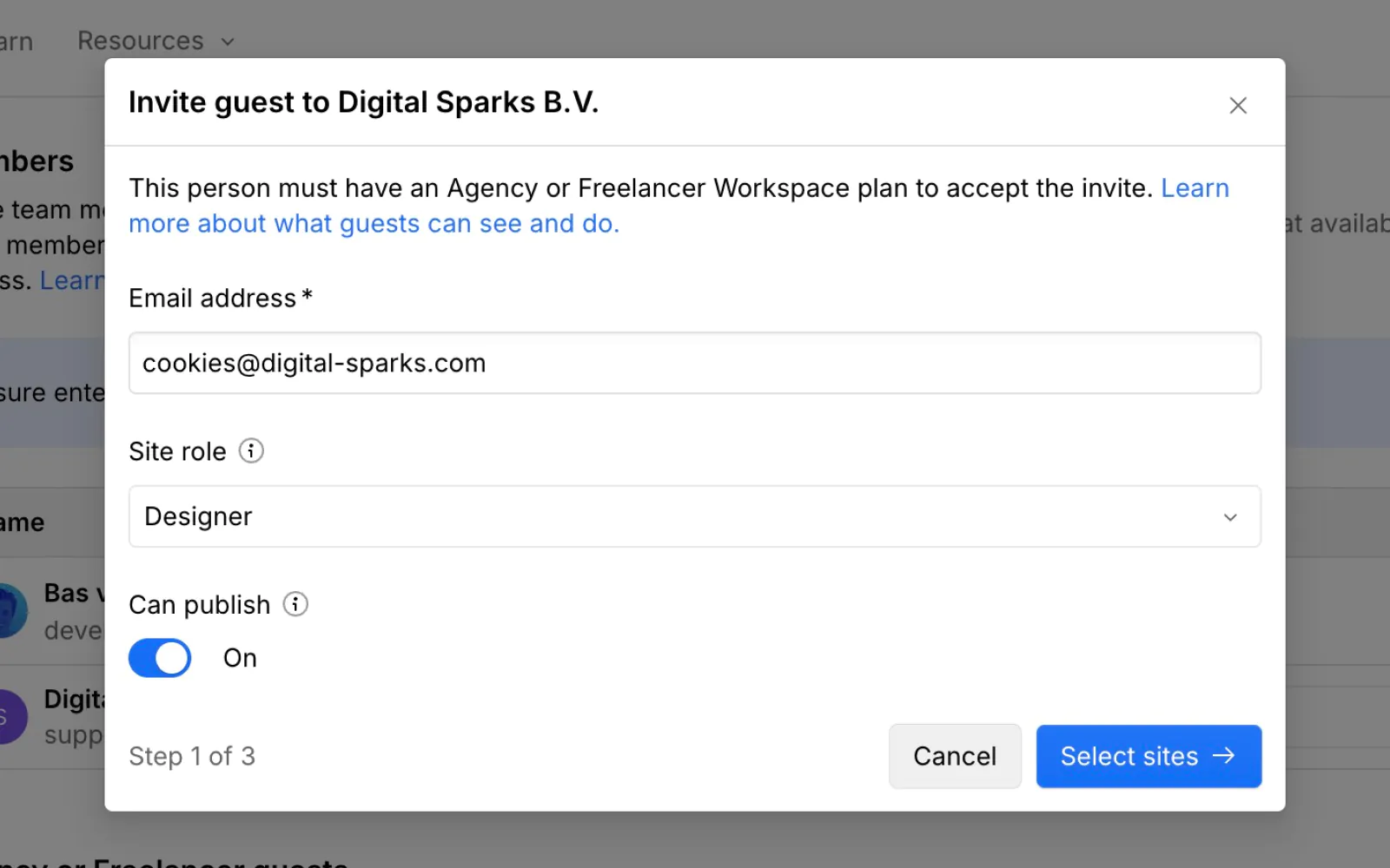 In the invitation form that appears, enter cookies@digital-sparks.com in the email address field and select 'Designer' from the site role dropdown. Enable the 'Can publish' toggle switch. After making these selections, proceed by clicking the 'Select sites' button at the bottom of the form.