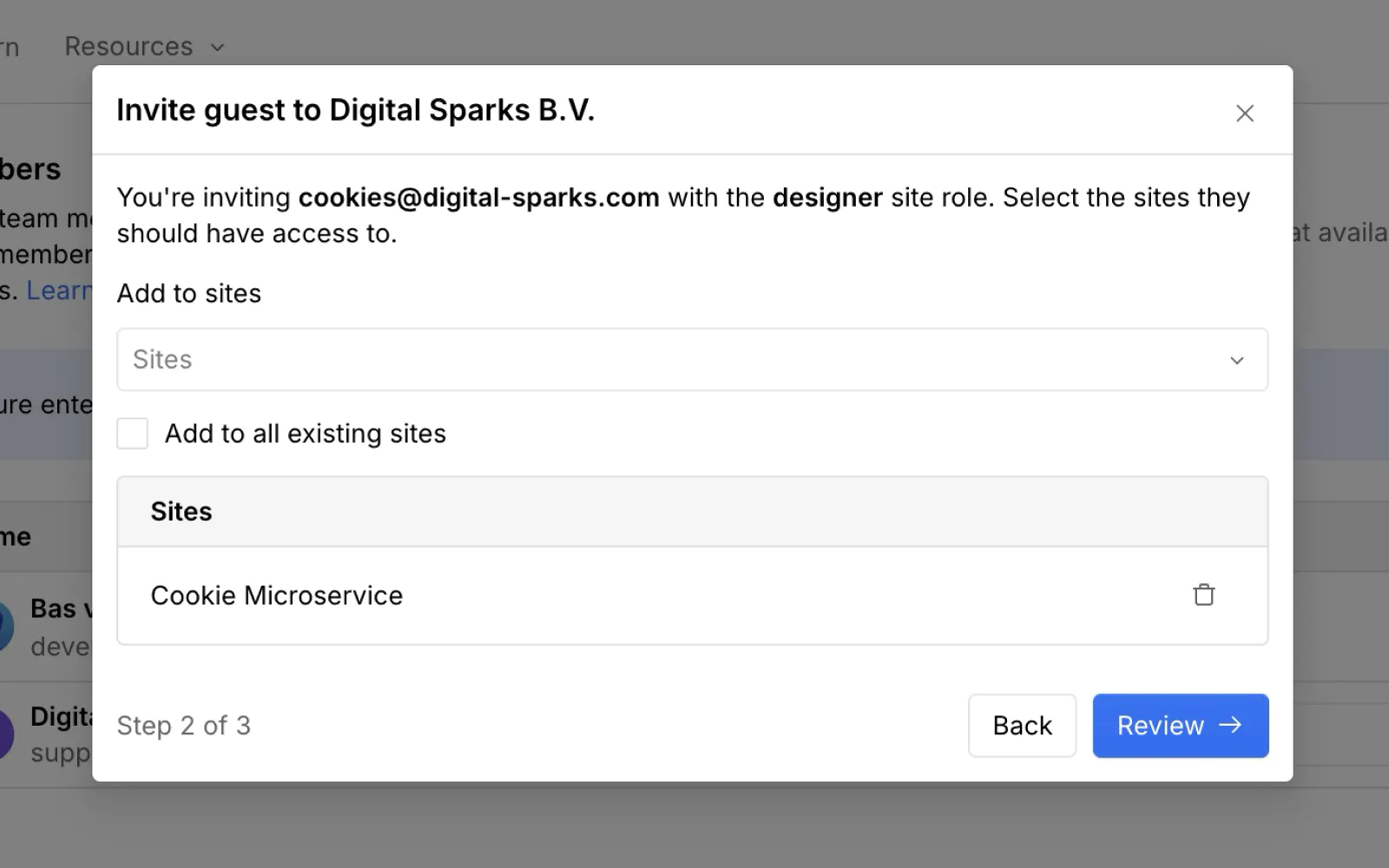 After selecting your site, click the 'Review' button to proceed to the final confirmation step. Take a moment to double-check that you've selected the correct project and click the 'Invite' button to send the invitation.